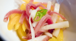 Az uborkát és a paradicsomot felszeleteljük, hozzáadjuk a kaprot vagy lestyánlevelet. A dinnyét kimagozzuk és felkockázzuk. A citromléből, olivaolajból, édes konyakból, sóból, borsból elkészítjük a saláta dresszinget és a ...
