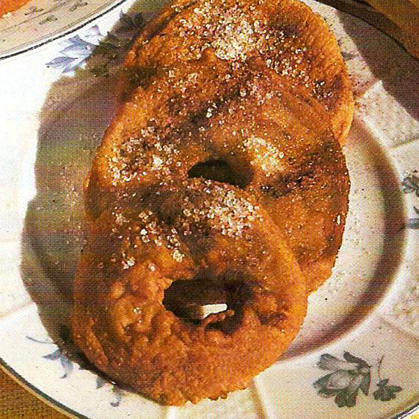 2. Palacsintatészta sűrűségű masszát készítek felvert tojásból, lisztből és sóból. A már megforgatott lisztes almakarikákat belemártom a masszába, majd bő, forró olajban kisütöm.