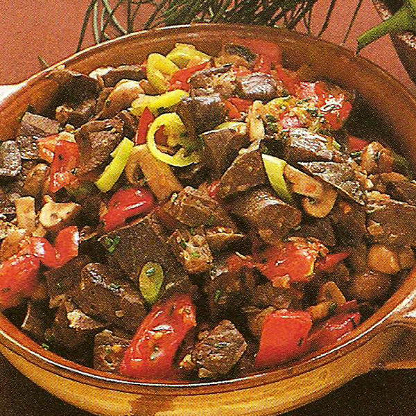 A sertéstüdőt sóval, egész borssal fokhagymával vízben puhára főzöm, majd kockára vágom. A zöldségeket és a gombát is hasonló kockákra vágom, és kevés zsíron a zöldségeket megpárolom, korianderrel ízesítem. Ha kész hozzáadom a tüdőt, fehérborral citromlével meglocsolom, pár perc múlva hozzáadom a paradicsomot, megsózom és melegében tálalom.